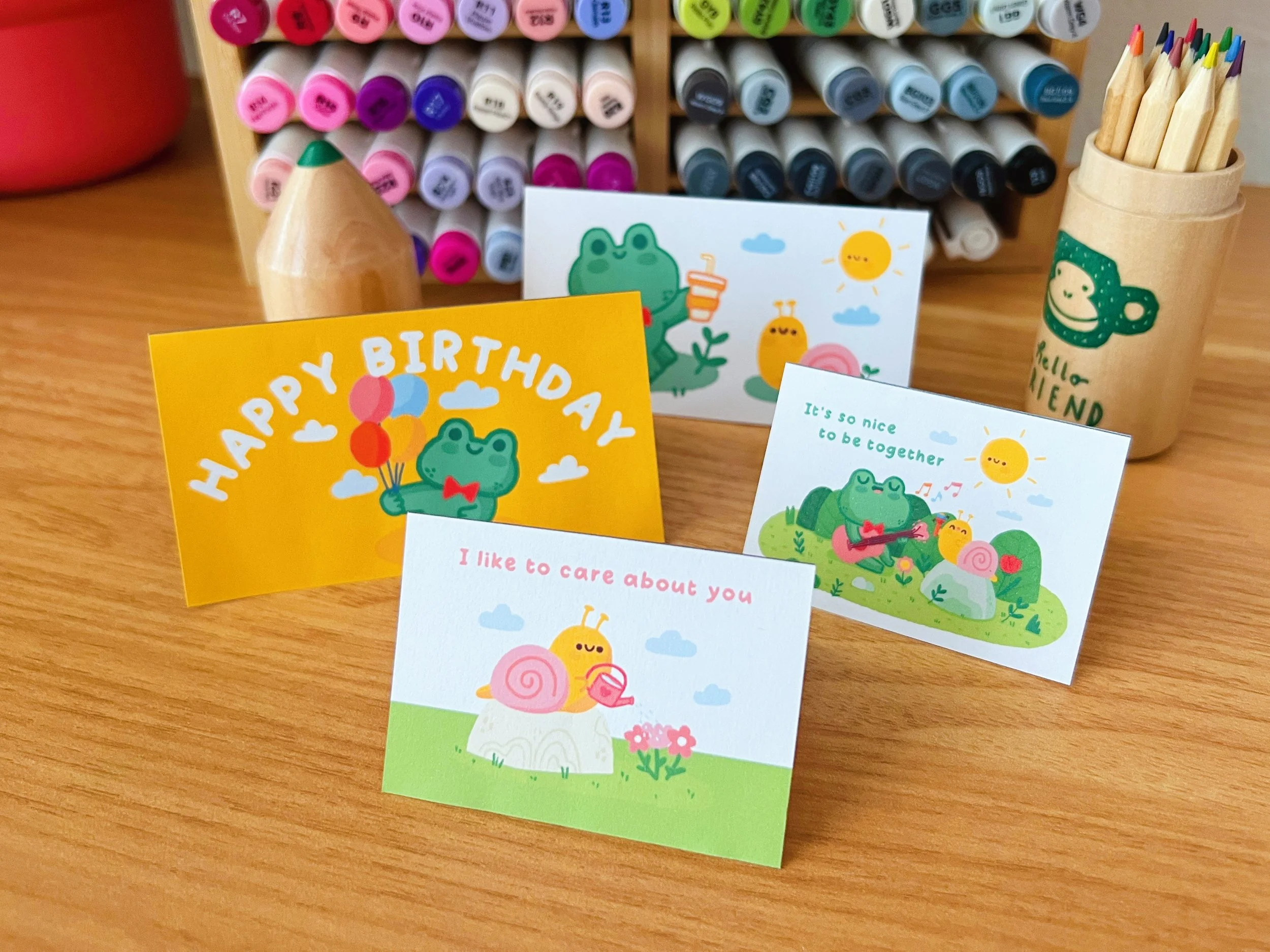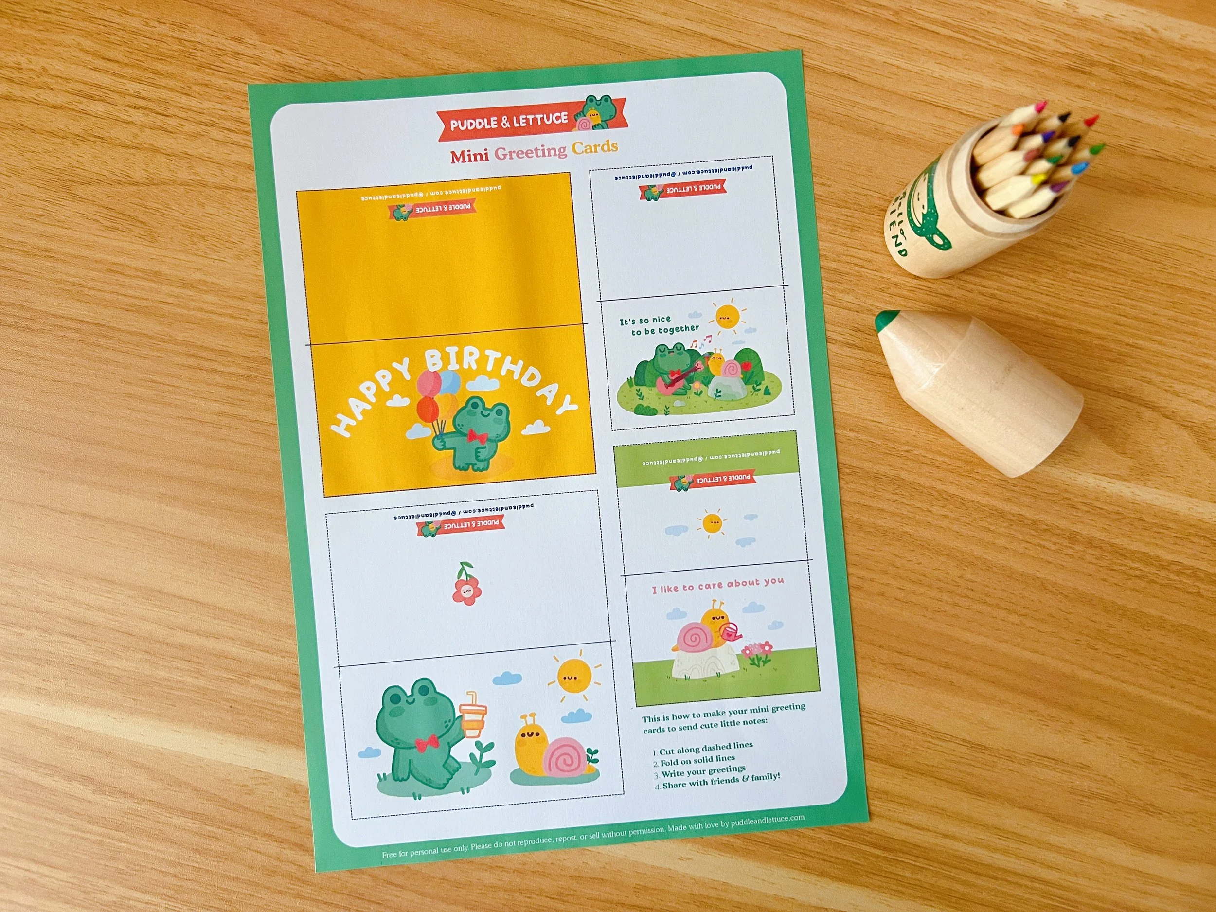 Puddle & Lettuce have you covered with 4 printable mini greeting cards! 🐸🐌